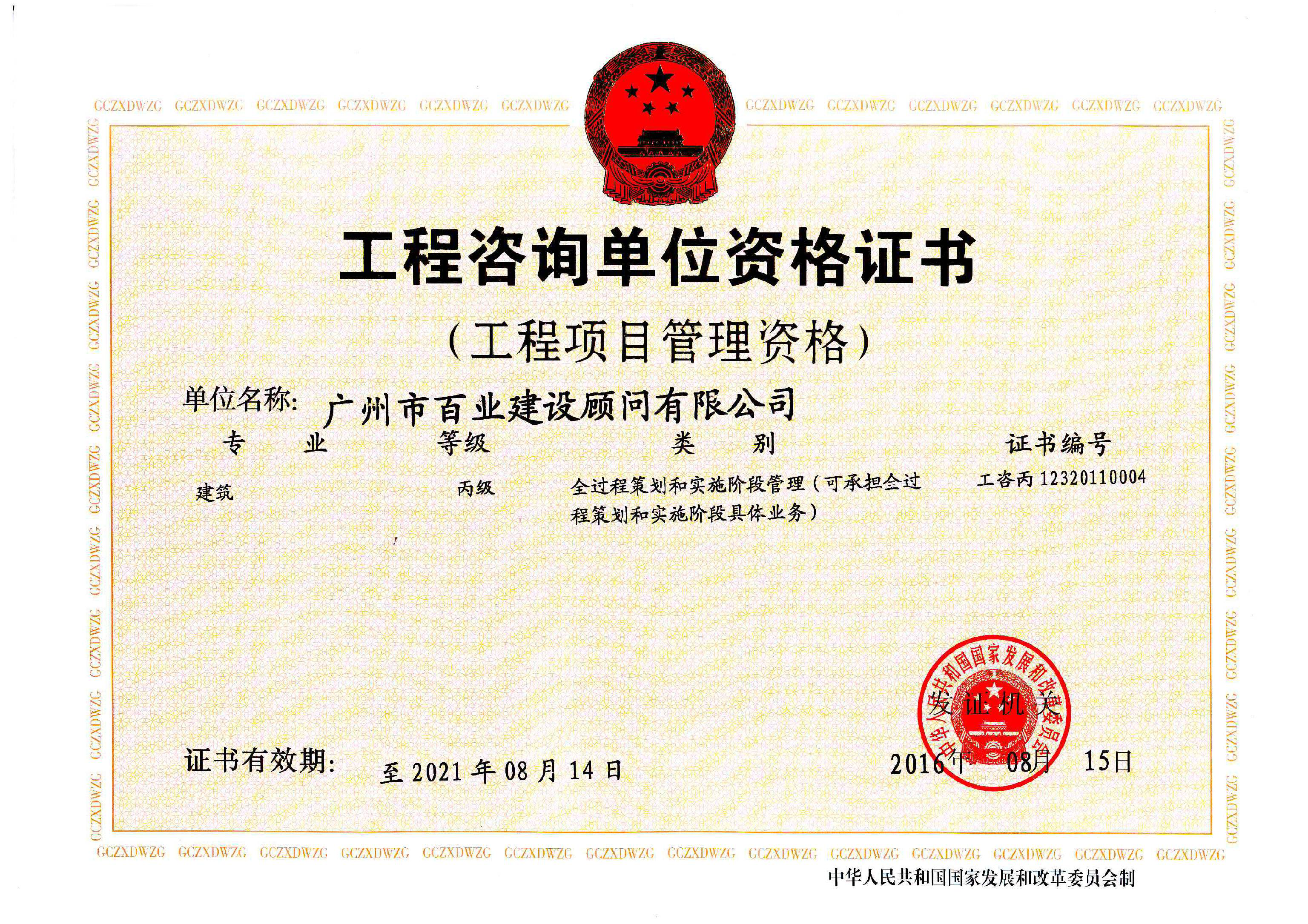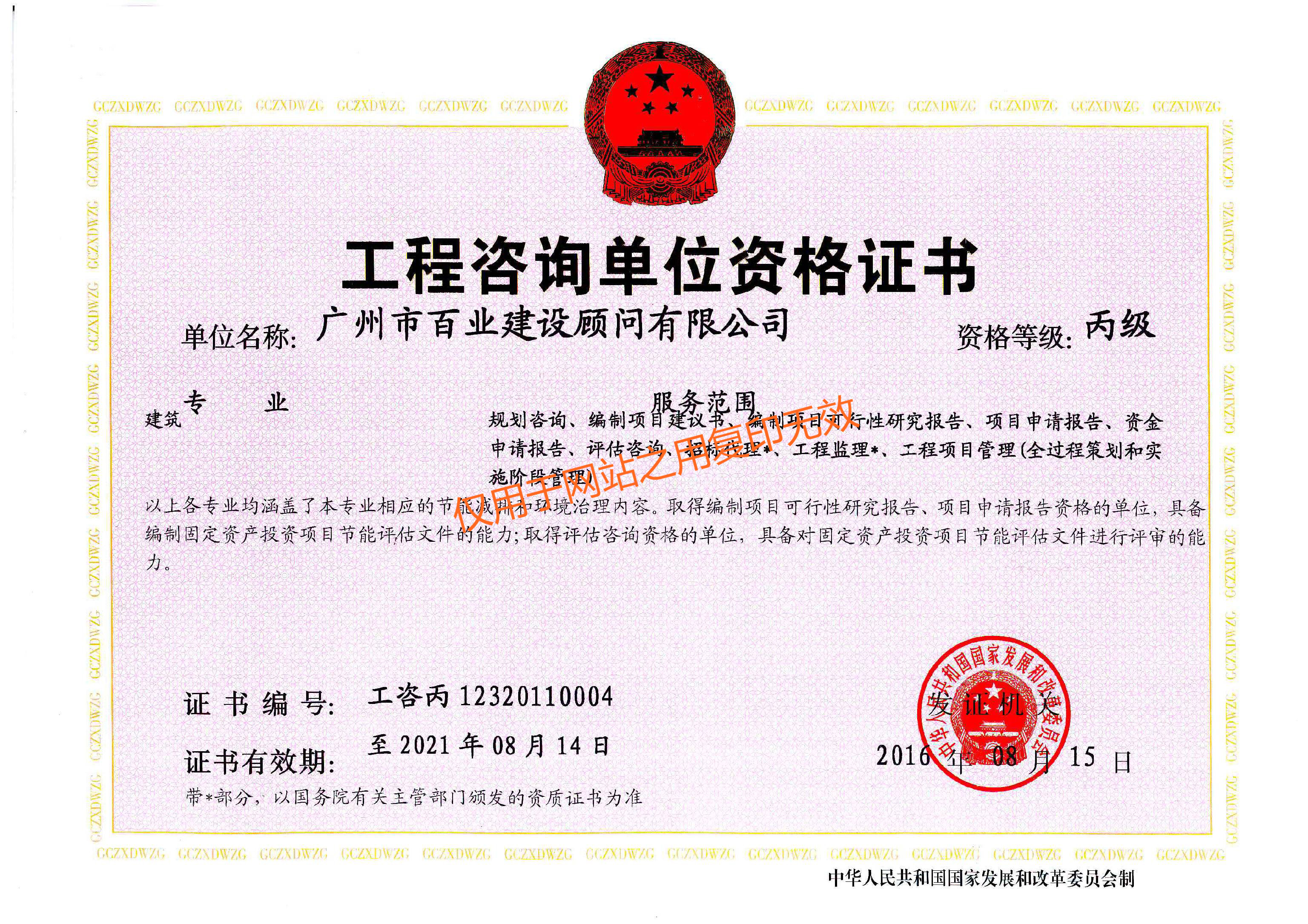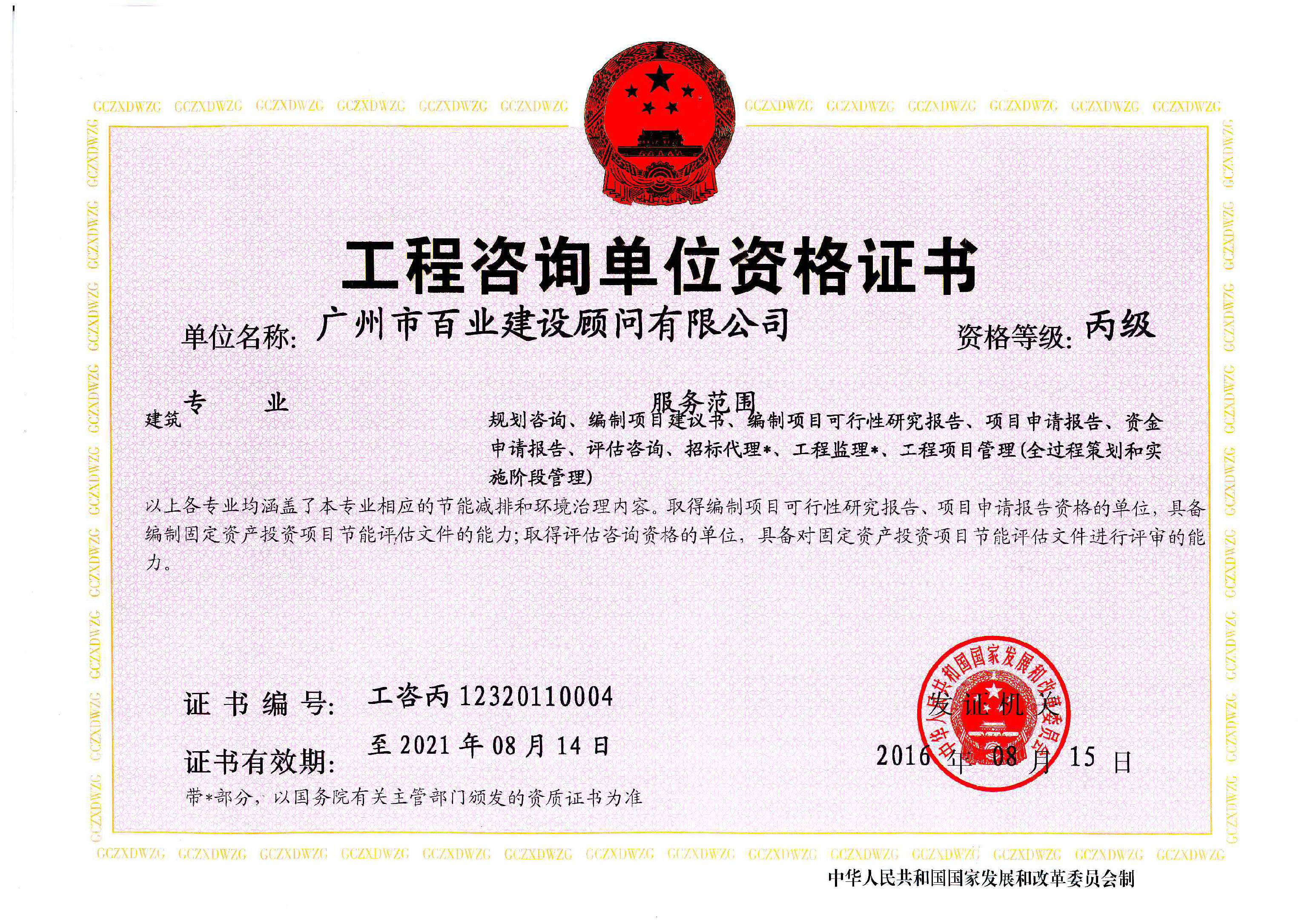 百业建设顾问有限公司是经国家建设部核准资质的建设工程专业型顾问公司,现具甲级工程监理,甲级招标代理及甲级造价咨询三甲资质。近年,本公司更获选为 "广东省工程造价协会第一届优秀会员单位"。